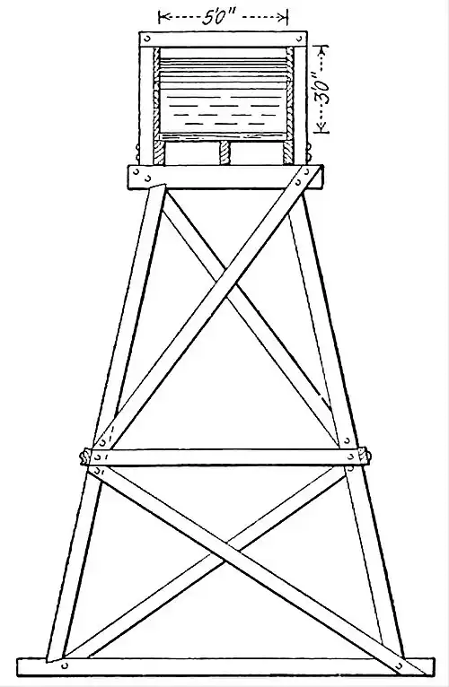 Artesian wells are a most important source of supply for irrigation in many western sections of the United States. In Kansas, Nebraska, and other States very fair supplies may be obtained from comparatively shallow wells by pumping. In California water is sometimes developed by tunneling into hillsides. Where pumps have been used they have generally been simple in construction and of small capacity. Large numbers of windmills are employed to drive small pumps on the Great Plains, mostly for domestic water-supply, but not infrequently for irrigation. Many of these are home-made, resembling the simplest form of paddle water-wheel, or are more elaborate, according to the mechanical ability or ambition of their makers, serviceable and durable windmills (q.v.) are now so cheap and so much more efficient than the home-made affairs that there is little excuse for not having one wherever it can be put to good use. Small storage reservoirs are a necessary adjunct of windmills, since there may be no wind when water is most needed, and since they also make it possible to save the night pumping. Such reservoirs may he constructed by intelligent farmers at comparatively little cost by throwing up earth embankments. In some cases a concrete or asphalt lining may be required to prevent leakage, but oftentimes the earth may be so packed, or puddled, by wetting and ramming it, as to make more expensive lining unnecessary. Where available, motor power is a cheap means of lifting water. Its applications to that end range all the way from a series of buckets mounted on a wheel placed in and driven by the stream to the most modern and efficient combination of pumps driven by turbines. Hydraulic rams are also employed.