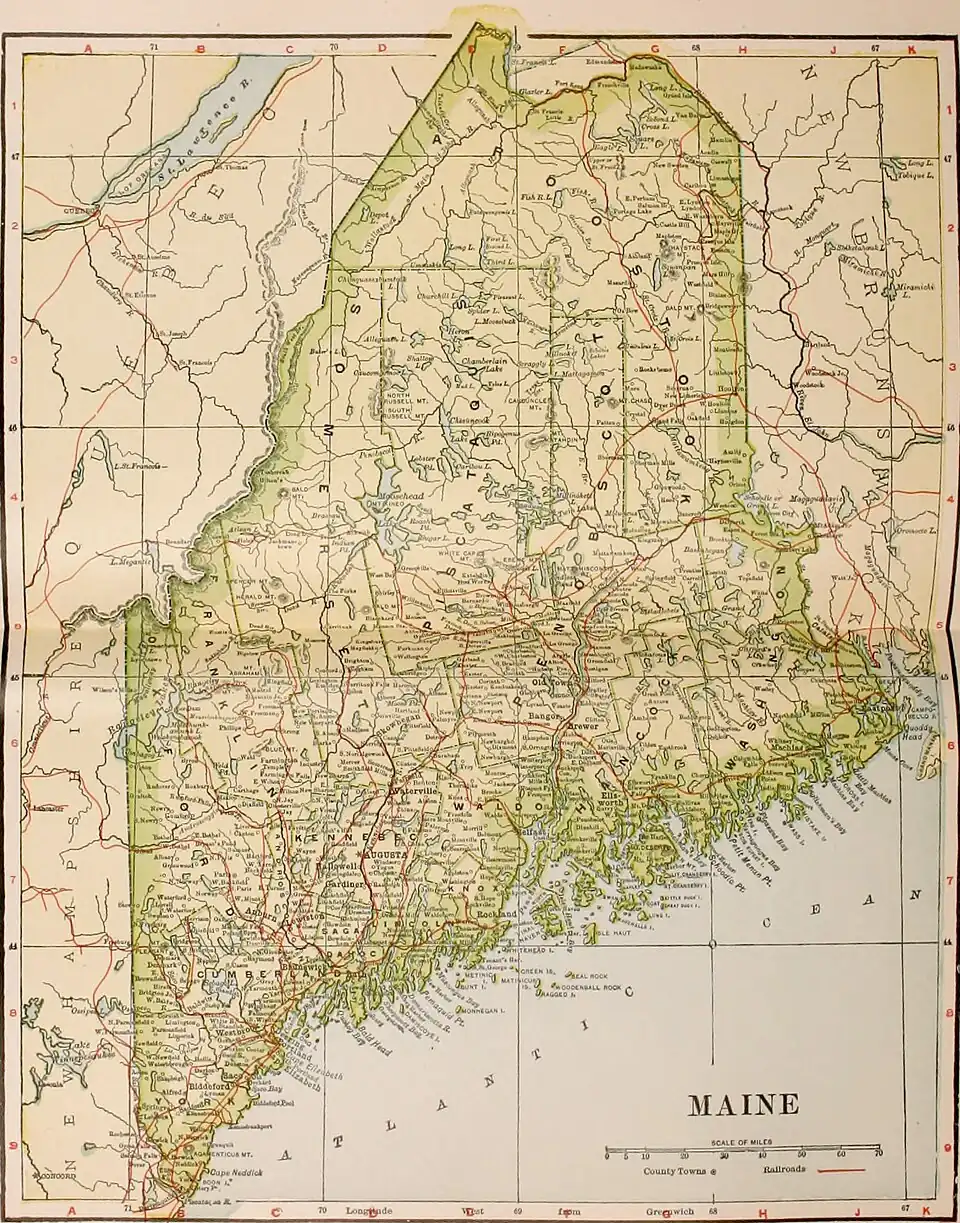 MAINE (called ‘The Province or Countie of Mayne’ in the charter granted by Charles I. in 1639, because regarded as part of ‘the Mayne land of New England’). A North Atlantic State of the United States, belonging to the New England group. It is the most northeasterly State of the Union, and lies between latitudes 43° 4’ and 47° 28’ N.. and between longitudes 66° 57’ and 71° 7’ W. It is bounded on the northwest by the Canadian Province of Quebec, on the northeast by the Province of New Brunswick, on the southeast by the Atlantic Ocean, and on the west by the State of New Hampshire. Its extreme length is a little over 300 miles, its extreme width 185 miles, and its total area 33,040 square miles, the land amounting to 29,895 square miles. Maine is nearly as large as all the rest of the New England States combined, and thirty-fifth in size among the States of the Union.