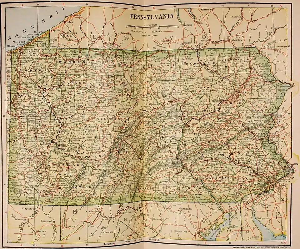 The colony's agent, Benjamin Franklin, vigorously resisted the Stamp Act, and in July, 1774, a Provincial Congress met at Philadelphia, adopted resolutions, and elected delegates to the first Continental Congress, to be held at Philadelphia. The Provincial Convention in 1775 authorized the Committee of Safety to prepare a system of defense for the colony. Troops were raised and boats were built. After the Declaration of Independence the Proprietary government ceased in Pennsylvania, and a State constitution was drawn up, September 28, 1776. It provided for a Supreme Executive Council, one Legislative House, and a Board of Censors. The Royal Charter was annulled by the King in 1778, and the State secured the commutation of the quit-rents in 1779. During the Revolution the eastern part of the State was the scene of important operations. Philadelphia was at different times the seat of the Continental Congress and the British headquarters. The question of the western boundary was settled in 1784, with the consent of Virginia, by measuring five degrees west from the Delaware River and then due north. The possession of the Wyoming lands was given to the State by decision of Congress in 1782. but when it was found that the line of 42° excluded Lake Erie, Congress, in 1788, authorized the addition of the triangle bordering upon the lake. In 1787 the State ratified the Federal Constitution. In 1790 a new constitution was adopted. The growth and prosperity of the State was marked, though the population was turbulent. The Whisky Rebellion (1794) grew out of the unwillingness of the Scotch-Irish to submit to the excise tax. The imposition by the National Government of the window tax led to the “Hot-water Rebellion” among a part of the German population in 1798. Internal improvements were projected early, and the Schuylkill Canal was begun in 1815 and completed in 1825. From 1829 to 1836 the projected improvements called for the construction of 292 miles of canal and 126 miles of railroad, at a total cost of $35,000,000. The first bill for a public school system was passed in the face of violent opposition in 1834. Though both iron and coal had been known to exist before the Revolution, it was not until 1839 that anthracite was successfully applied to the manufacture of iron. The first oil well was sunk near Titusville in 1859.