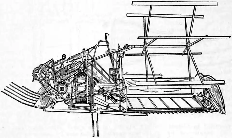 The most advanced and complicated type of harvester is probably the combined header and thresher which is used to a considerable extent in some parts of the Western United States and in Australia, where there is no fear of rain during the harvest. This machine heads, threshes, cleans, and sacks the grain at one operation. Machines of this kind are pushed through the grain either by a traction engine or by horses, thirty to forty of the latter being required for each machine. They have a capacity of from 60 to 125 acres per day. Headers are also made for use uncombined with a thresher. The cut grain is deposited by means of elevators in wagons which are drawn beside the headers. It is stated that as early as 1850 a machine was invented and successfully tried in Devonshire, England, which stripped the grain from the straw, cleaned it, and ground it into flour at one operation.
