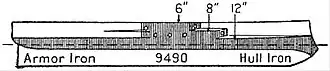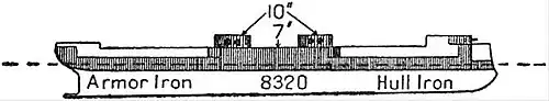In 1861, under an act of Congress providing for armored vessels, the Galena, the New Ironsides, and the Monitor were constructed. The Galena was an armored gunboat of the ordinary type, except that her sides amidships inclined inward (‘tumbled home’) at an angle of about 45 degrees and were covered with 2.5 inches of armor. Her plating was found to be too thin to be of much use and she was regarded as a failure. She was completed early in 1862 and took part in the attack on Drewry's Bluff forts, when her armor was repeatedly perforated. In this case, since the forts were elevated, the inclination of her sides was a disadvantage. The New Ironsides was finished late in 1862 and attached to the blockading fleet off Charleston, where she remained for two years. She was built of wood and her general plans were similar to those of an ordinary steam frigate of her day, except that she had a ram bow and a retreating stern like that of many recent battleships. Her sides ‘tumbled home’ at an angle of about 30 degrees from the vertical for about two-thirds her length, and over this portion she was covered by 4.5-inch iron plates of large size from some distance below the water line to the upper deck. The broadside armor was joined at the ends by thwartship plating of equal thickness, the whole forming a citadel protecting the battery, boilers, and engines. She was 232 feet long, 58 feet broad, and had a displacement of 4120 tons at her designed load draught. Her battery consisted of sixteen 11-inch Dahlgren smooth-bores, two 220-pounder Parrot rifles, and four 24-pounder howitzers. She was the most successful armored ship of her day, was in action more times than any other vessel ever built (so far as existing records show) and was struck by more projectiles than any other vessel, yet her armor was never pierced, she was never put out of action, and she was never forced to go to a home port or depend upon outside assistance, while in some of the actions in which she was engaged other ironclads were sunk and several monitors were disabled and forced out of action. After the war, in 1866, she was accidentally destroyed by fire at the Philadelphia navy yard.