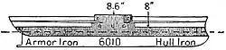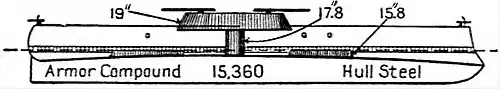 carried from 4.5 to 6.75 inches. The keel was not laid until 1854, only two months before the commencement of the ‘Kinburn batteries’ in France, but it is to be noted that the French vessels were floating batteries and not high-speed sea-going ships, as was Stevens's. The latter, whose construction, after the death of R. L. Stevens (1856), was continued by his brother, E. A. Stevens, was never completed, and the French were the first to produce a sea-going armorclad, the Gloire (for description see Armor Plate), which was a screw line-of-battle ship rebuilt in 1858-59 and armored; they also commenced the first iron-hulled armorclad (the Couronne) . The Gloire and Couronne were quickly followed by the Warrior, which was laid down in England in 1859. In 1860 the Italians ordered the armored frigates Terribile and Formidabile in France; and in the latter part of 1861 the Russians changed the plans of the wooden frigate Petropavlovsk, then building, and gave her a complete water-line belt and casement of iron. So far the application of armor to vessels had brought about no change in the type except to reduce the number of decks on which guns were carried. But in 1861 the Monitor and Merrimac (Virginia) were designed. They differed from all previous men-of-war in being mastless; each was completely armored: one mounted its guns in a revolving turret and one in a central armored battery. If you place a monitor's turret at each end of the Merrimac's citadel, make the sides more nearly vertical, and raise the upper deck sufficiently to give seaworthiness, you have the general features of the battleship of 1903.
