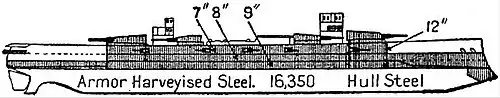 As regards belt armor, the vessels of the Oregon class have water-line belts extending for little over half the length amidships; the Iowa’s belt is proportionately much longer; in the Kearsarge and Alabama classes the belt is extended to the bow; while in the Maine, Georgia, and Connecticut types it extends to the stern as well. Reference to the cut in the article Shipbuilding, showing a midship section of a modern battleship, will illustrate the arrangement of the armor.