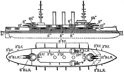 and stern. In the last named four guns of 9.2-inch calibre were added to the auxiliary