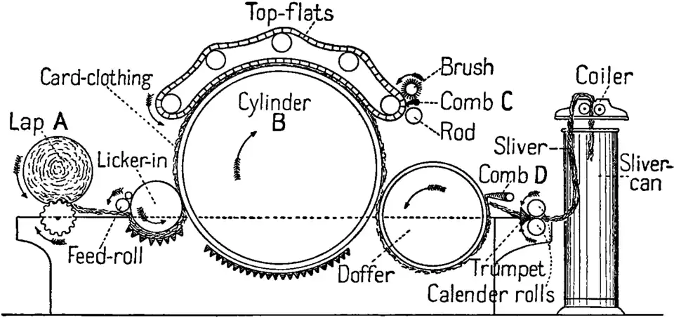 During the nineteenth century many important improvements were made in the details of the construction of spinning machinery, but the general principles are those worked out a hundred years ago. The greatest improvements have been changes in the construction of spindles, allowing them to revolve more rapidly and freely. In the modern factory spinning is the final process in a series of operations necessary to convert the raw fibre into thread. Each of these processes has for its object the removal of smaller and smaller impurities and the production of a finer and stronger thread. These are: (1) opening and picking; (2) carding and combing; (3) drawing; (4) roving; (5) spinning. Other intermediate operations may be introduced.