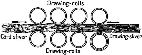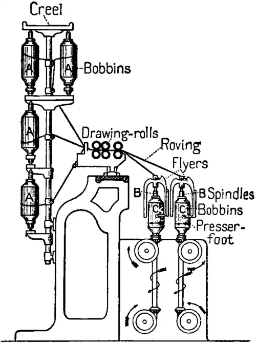 In the spinning jenny a number of large reels of fibre formed into a thickish coil, called a roving, were set on upright fixed spindles, and the ends of the rovings were passed between two small movable bars of wood placed horizontally and under the control of the spinner, who could thus make them press more or less on the roving, and consequently increase or decrease the draw upon it from the spinning spindles, which were set in a row at the other end of the frame, and all capable of being set in motion simultaneously by the wheel. The spinner drew out the rovings by moving the bars back and forth and at the same time turned the crank with his right hand to rotate the spindles.