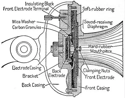 The Bell telephone, which has survived as the modern receiver, served both as transmitter and receiver in the early apparatus. A reference to the accompanying diagram showing a cross section of a modern unipolar receiver will make clear its action. There is a hard rubber case hollowed at its upper extremity and containing the soft iron diaphragm about 1/100 inch thick and two and a quarter inches in diameter, with free part one and three-fourths inches across, which is tightly held at its circumference, but its centre is free to vibrate. A bar magnet, either single or compound, carries at its upper end a coil of fine silk-covered wire (No. 38 B. & S. gauge generally) with resistance of about 75 ohms, whose terminals connect with the binding posts. A more powerful receiver can be constructed by employing instead of a single magnet a horseshoe magnet with coils on each pole. In the Ader bipolar receiver, used extensively in Continental Europe, the horseshoe magnet is ring-shaped and outside of the diaphragm, and in front of the pole pieces a soft iron ring is placed with the object of strengthening the field of force between the poles. The diaphragm of a telephone receiver is in close proximity to the pole or poles of the magnet, but not in contact. When used as a transmitting instrument this diaphragm will vibrate under the influence of the voice, its movement being caused by the movement of the air known as sound waves. The diaphragm rapidly approaching and receding from the magnet consequently produces currents by induction in the wire of the coil. These currents will be transmitted over the line wire, and, flowing through the coil of the receiving instrument, will cause its magnet to become more strongly magnetized and the diaphragm to be attracted. The diaphragm of the receiver will accordingly move in unison with that of the transmitter, and consequently the sound wave which impinges on the latter will be reproduced. The ground can be used as a return or the circuit can be of wire throughout. The currents of electricity that were transmitted in this way were too feeble to produce satisfactory sounds at the receiving instrument when there was a line of any considerable length, and it was necessary to find a better transmitter. Accordingly there followed the carbon transmitter, where the change of resistance of carbon under pressure produces pulsations in the current corresponding to the vibration of the sound waves.