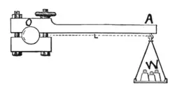 Dy′namom′eter, strictly an instrument to measure a force tending to produce motion. Thus, a spring-balance is sometimes called a dynamometer. The term, however, is commonly applied to an instrument to measure power. Power is rate of doing work. Work is force overcome through distance. The unit of work used in engineering is the work done in raising a pound-weight one foot against gravity, called a foot-pound. When a machine does work at the rate of 33,000 foot-pounds in one minute, the power is one horse-power (H. P.). The power-unit used by electricians is a kilowatt (K. W.), equal to 1⅓ H. P. A dynamometer is technically used in engineering for any device which measues H. P. One of the simplest and most common forms is the Prony brake. A block B is clamped fairly tight on the pulley O of the machine. The machine then does work against friction. The force is balanced by the weight W on the lever-arm AO. From the speed of rotation, the lever-arm and the force W, the power is directly calculated. For the many forms of dynamometers, see J. J. Flather’s text-book on Dynamometers. A wattmeter measures electrical power in watts. It is an instrument for measuring the product of the pressure (volts) and current (amperes), which gives the watts directly. The best known forms are those of Siemens and the modified forms of Weston.
