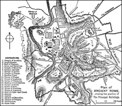 Rome. Modern Rome occupies the plain on each side of the Tiber (about 15 miles from the mouth) and the slopes of seven hills, the central one of which was the Palatine hill, whose summit is about 160 feet above the sea. These gave Rome the name of the City of the Seven Hills. Romulus is said to have founded the city upon the Palatine, and upon its northwestern slope grew the sacred fig, under which he and his brother Remus were found sucking the she-wolf. Upon this hill were the temple of Jupiter Stator and other sacred buildings, besides many of the finest houses in Rome. Recent excavations have brought to light numerous remains of the palatial and other structures with which the Palatine was once covered, and these are among the most interesting remains of the Eternal City. The Palatine was fortified at a very early period, and in the time of the later or Etruscan kings at least five of the hills had been surrounded by separate defenses. These fortified hills with the marshy hollows between them were then enclosed by a huge rampart or agger of earth. This agger formed the only defense until the reign of Aurelian 800 years later, and the great wall which bears the name of Aurelian is to a great extent identical with the present walls. To the period of the kings belongs the huge, arched sewer which drains the marshy hollow between the Capitoline, Palatine and Esquiline hills. In this valley was situated the Forum, containing about two and one half acres, which became both the market and the place of political meeting for the tribes that occupied the surrounding hills.