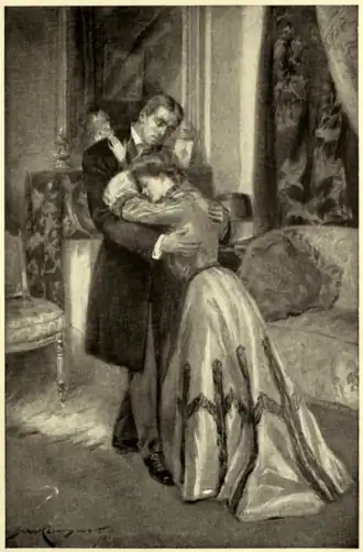 He trembled, hesitated, and then slowly drew her to his heart. Her arms stole around his neck and her head drooped on his breast, the perfume of her hair was in his nostrils, and their lips met in burning kisses.