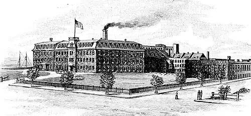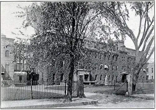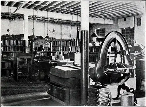 The original building, a three-story structure of brick, sixty feet by forty, may still be distinguished in the midst of the group by its old-fashioned style and dormer windows. It is connected with the fireproof warehouses that stand nearest the river, and forms an extension at the rear of the main building, which is four stories in height, and has a frontage on the east of one hundred and seventy feet, and an equal frontage on the north. On one side of this central group is a new Stock Building, and on the other a large building used for type-setting and dry-pressing, an Electrotype Building, and a Press Building with a large new addition, while in the rear is a one-story brick safe for the storage of electrotype plates, and a capacious engine and boiler house.