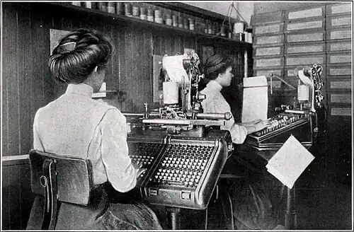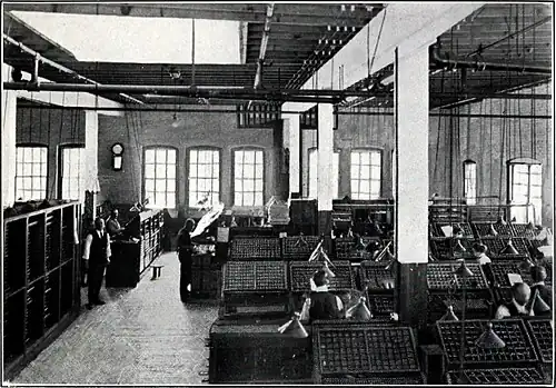 The large and sunny offices occupy the second floor of the eastern wing of the main building. Here the heads of the various departments, with their corps of assistants, clerks, book-keepers, cashiers, and stenographers, have their desks. On one of the walls hangs a three-quarters-length portrait of Mr. Henry O. Houghton, Senior, painted by Robert Gordon Hardie in 1895, and presented to the Press by its founder. Leaving the counting-rooms, let us follow the manufacture of a book in all its stages.