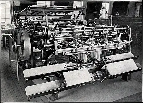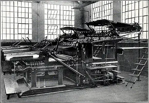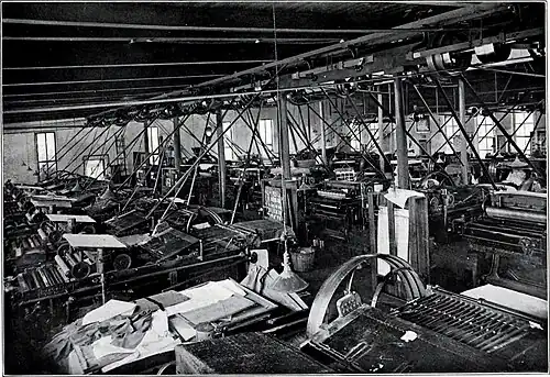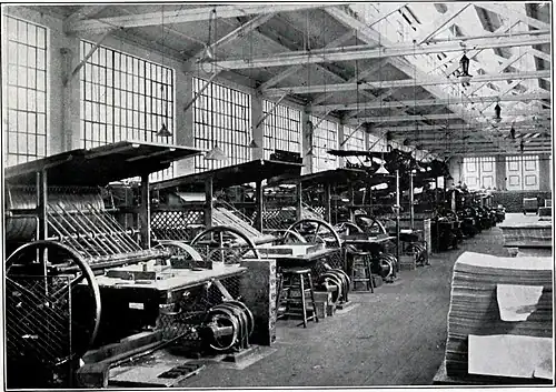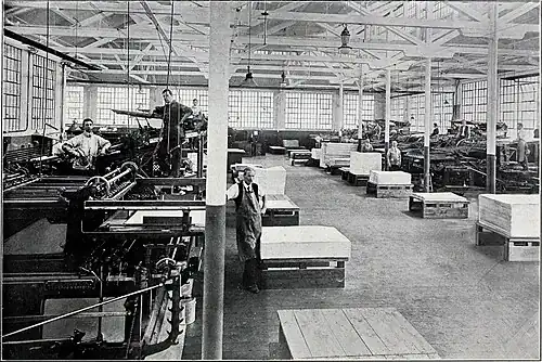 complete outside tank and hydrant system gives adequate protection, in addition to that of the Cambridge Fire Department, with which the buildings are connected by an automatic alarm. The automatic sprinkler system is installed throughout, and a fire brigade, composed of eighty employees, is kept in constant training. In one of the buildings is a machine shop where a force of machinists is employed in making necessary repairs and alterations. There is also a large paper warehouse in which some five hundred tons of printing paper are usually on hand. In this connection, some idea of the size of the business may be gained from the fact that the Press uses from 2000 to 3000 tons of paper a year.