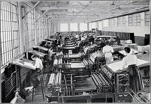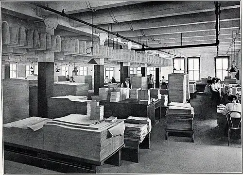 The Adams and job press-rooms are in the old Press Building, together with the make-up rooms, cut rooms, etc. The Adams presses, smaller and slower running than the cylinder presses, are used for printing the smaller editions, and much of the finest letter-press work is done on them; nearly all the work is printed on dampened paper. One of the distinctive features of this building is the private apartment for the women press-feeders. This is a cheerful, well-lighted room, provided with suitable furniture, where the women may occupy themselves with sewing, conversation, or lunch in the intervals of the work.
