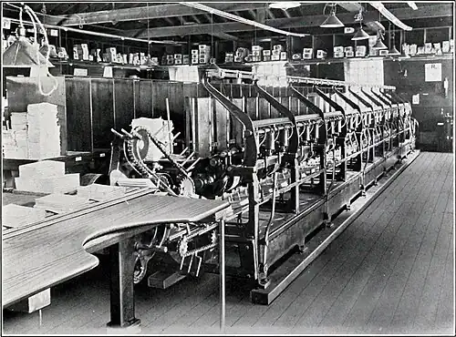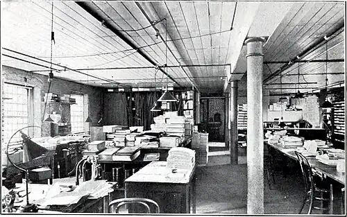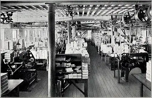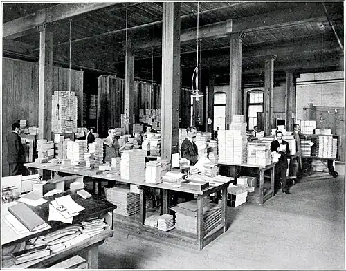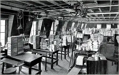 The large increase in the publishing business of Houghton Mifflin Company during the last ten years, and the yearly addition of about 150 new books to their list of over 4000 titles, necessitated the erection in 1908 of a new building, 117 feet by 68 feet, for shipping and storage purposes. It has space for over two million bound books and a stock of three quarters of a million is constantly on hand, including a large supply of Webster's International Dictionary, which for almost fifty years has been printed and bound at The Riverside Press for G. & C. Merriam Company of Springfield, Mass. It also contains a large Shipping-Room, with the necessary offices and with facilities for filling all orders with great promptness. The Mailing-Room, from which the Atlantic Monthly and other magazines, circulars, and mail orders for books are sent out, is on the ground floor of the main building next to the Shipping-Room. In the fire-proof warehouses near the river are stored from two to three million books in sheet form ready to be bound whenever needed.