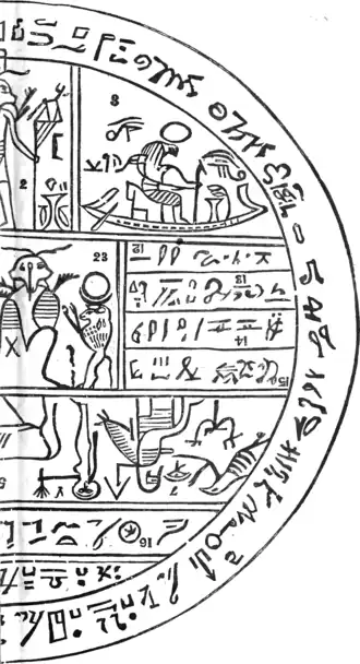 | VIII. Contains writing that cannot be revealed unto the world; but is to be had in the Holy Temple of God. | VIII., IX., X., XI. Four lines of the linear hieroglyphic text, which are numbered from bottom to top, instead of from top to bottom. The meaning is: O great God in Sekhem; O great God, Lord of heaven, earth, and hell. . . . Osiris S'es'eng. These last words inform us that the personage in whose mummy this hypocephalus was found was called S'es'enq or S'esonchis, a name written Sesak in the Bible, and of which there is no known example anterior to the twenty-second dynasty; that is, to the ninth century before our era, but which may be much posterior to it. |