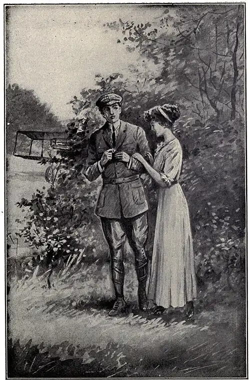 days." And this remark made Nellie blush as deeply as had Dora. Sam said something, too, to Grace about a ring, at which she laughed merrily and slapped his face. But when the boys were in the biplane and ready to sail away, and he held up a finger with a ring on it and looked at her questioningly—and longingly—she gave a quick little nod of her curly head.