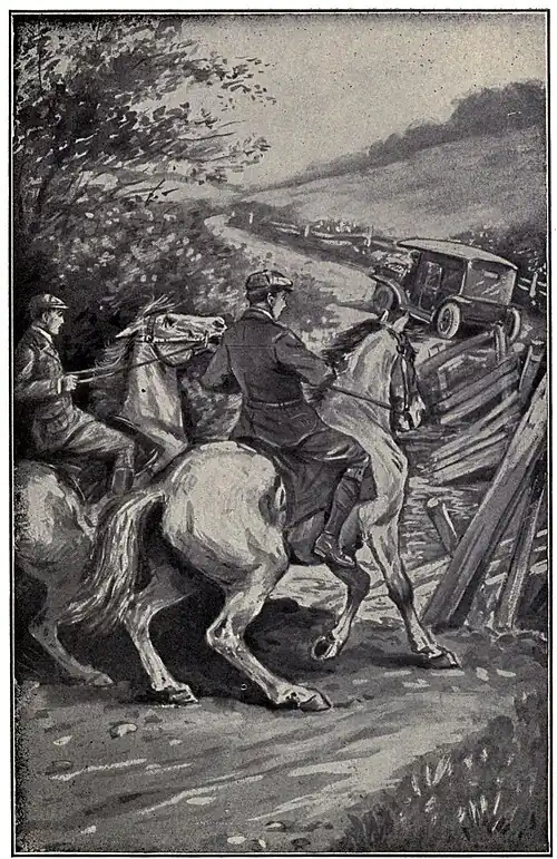 Past the deserted house they rode, and then around a turn where were located several other houses and barns. Then they came in sight of the deserted mill, down in a hollow by a stream. Further still was a bridge and not far from this structure stood a big, enclosed touring car painted dark blue!