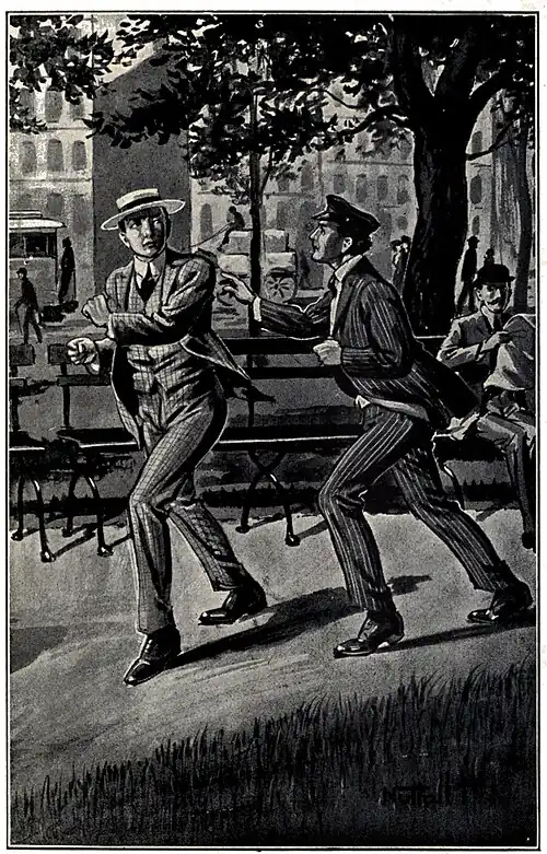 "Well, you behave yourself," growled the guardian of the peace, and Dick was glad enough to get away with this reprimand. He saw Cuffer running for the stairs and made after him as rapidly as the density of the crowd permitted.