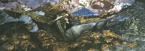 But at the same time Vrubel is a true décadent and herein lies the cause of his failure to achieve success not only among the public at large, but also among artists. We do not mean to say that Vrubel ever played antics to please the fad of the hour, or that he purposely distorted his art. Vrubel is just such a décadent as Beardsley, Somov, Gauguin, as Tiepolo and Watteau in former days, as the art of Rococo, and as that of the "flamboyant" Gothic style and of Romanticism. Vrubel is excessively exquisite, too refined, too far removed from common understanding. At the same time,—and this is a feature of the end of the nineteenth century—his magnificent art is full of inconsistencies, of chasms and oddities. Many see in these deficiencies the first signs of his insanity, but it appears to us that his disease was to a considerable degree caused by the consciousness of these deficiencies, which he could not correct, and which were rooted in the entire state of contemporary art. The struggle of a soul of an artistic genius with the inability to express itself,—thus can the tragedy of Vrubel's life be characterised. The horror in this duel was all the greater in that his impotence seemed to mock at him,—in that it was not an organic quality of his nature, but rather a demoniac principle, which unexpectedly invaded his work.