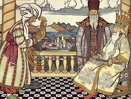Bilibin is the Petrograd version of the artistic current which was represented in Moscow by Miss Polyenov. Early in his career Bilibin even imitated her, acquiring from her merits as well as defects. By and by, however, Bilibin found his own way, and, although Miss Polyenov's fairy-tales were his point of departure, he left his prototype far behind him; so that there is ground to believe that in the future this conscientious and gifted artist will succeed in creating a distinctive place for himself and in producing harmonious, original productions of a high degree of perfection. Meanwhile, Bilibin is passing through a transitory phase. He is gradually freeing himself from dilettanteism, and is developing his palette and technique; at the same time he drinks from the well of popular motives, which he studies with great assiduity. A few more efforts which would increase his effectiveness, dramatic power, and stylistic harmony, and which would help him to get rid of misplaced pedantism and a certain dryness in execution—and we shall have in Bilibin an admirable artist.