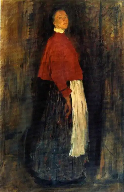 The third prominent Russian master is Malyavin. He is Repin's disciple, but he is to Repin as Goya is to Velasquez, or as Fragonard is to Watteau. The sober, normal painting of Repin, his conscientious service of art, in the sense in which the school of the sixties understood it, his rationality have turned in Malyavin into a bacchic feast of colour, into most dashing display of skill, into a hazy and lax monomania. Malyavin has something in common with Bénard: by some peculiarities of his technique he approaches the Scottish artists; finally, his kinship to Zorn cannot be denied. Yet, technically Malyavin is weaker and at the same time more powerful and interesting than these artists. He has less conscious skill and culture; his views are more limited, the colours coarser, the painting more slovenly,—but there is more "authenticity" in his art; he is freer, more elemental; he is a true artist, savage, revelling in red fustian stuff like a Negro,—a genuine artistic temperament strange to cold calculations in his work. In this respect he approaches the Impressionists.[1] Yet Malyavin is by no means an Impressionist. He has never aimed at studying colours in nature, never endeavoured to render the delicate charm of relationships, the stir of life, the poetry of the unexpected. Malyavin, the true, mature Malyavin is nothing but "the singer of Russian peasant women." He paints them in all their ugly majesty and in all the richness of their dazzling colours. He loves the Russian "baba" (peasant woman) as the pagan does his idol; he worships her, with her red fustian cloth, her coarse coquetry, her haughty grin and all her clumsy appearance, which mocks all the canons of pulchritude and has yet a peculiar beauty. It is before this graven image that Malyavin kneels and burns incense,—a phenomenon marked with the imprint of spiritual degeneration, but not devoid of grandeur.