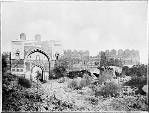 The enemy's artillery being placed in batteries soon made numerous breaches in the shaky old walls; his point of attack was the tower at the south-east angle, then called the "Nila Burj," now improved into the Wellesley Bastion. The rotten wall came down in large masses, and a breach was formed nearly a hundred yards long, but an earthwork was made in rear, and was repaired as fast as it was damaged by the heavy fire. An attempt to storm was repulsed, and gradually the defences at this point were made so strong as to relieve anxiety. A successful sortie against the enemy's batteries, on the night of the 10th of October, made him turn his eyes to another point of attack. The Ajmere Gate, and the curtain between that gate and the Turkmān Gate, were now bombarded, but similar measures of defence resisted all attempts to enter the city; after a final assault on the 14th, the Mahrattas retired towards Rewari, three days before the commander-in-chief, with a relieving force from Agra, reached Delhi. Had the enemy attacked at several points simultaneously in the long enceinte the place must have fallen; but that does not detract from this most gallant defence.