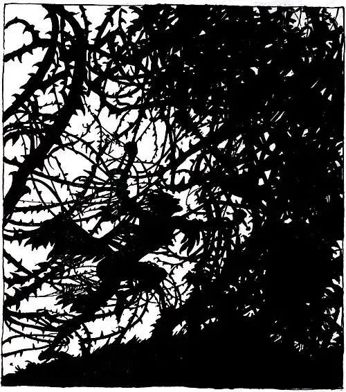 And all round the castle there grew up a hedge of thorn, tangled with ivy, woodbine and creeping plants, so dense that from a distance it seemed like a little wood. Higher and higher it grew, closing round the castle like a wall until all that could be seen was the top of the highest tower, and the flagstaff from which the royal standard hung limp and motionless.