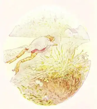 HE scrambled out on the first bank he came to, and he hopped home across the meadow with his macintosh all in tatters.