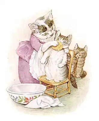 BUT one day their mother–Mrs. Tabitha Twitchit–expected friends to tea; so she fetched the kittens indoors, to wash and dress them, before the fine company arrived.