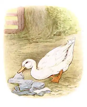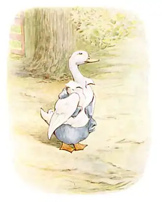 THEN the two duck-birds, Rebeccah and Jemima Puddle-Duck, picked up the hat and tucker and put them on.