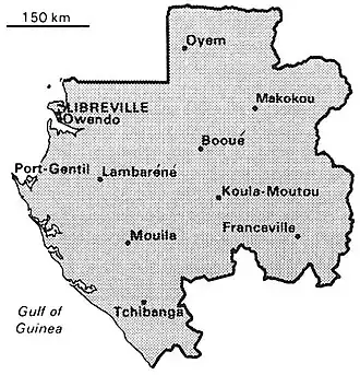 Administrative divisions: 9 provinces; Estuaire, Haut-Ogooué, Moyen-Ogooué, Ngounié, Nyanga, Ogooué-Ivindo, Ogooué-Lolo, Ogooué-Maritime, Woleu-Ntem