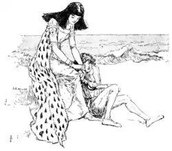 Thursday evening Rend led the Princess to the seashore. It was here he had to defend her. But he was not very brave, so instead of waiting near her he climbed a tree and hid among the branches. In vain the Princess begged him to assist her.