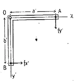 Since the world-line direction coincides with the time axis of the co-moving system, then the plane to be defined is identical with the previously mentioned plane . We want to apply the rule just obtained upon the broken lever of Lewis and Tolman. From the standpoint of the resting observer, the lever arms are: in the -direction and in the -direction (for the sake of generality, we assume them as being different). Force acts upon the first one; forces and upon . The -plane of the co-moving system is rotated towards plane by the angle around the -plane. The projections of the lever arms upon this plane, thus read , , and those of the forces , , . The equilibrium condition is therefore