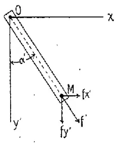 For this purpose, we first want to discuss a somewhat simpler case. A massless rod is rotatable mounted at point , and a mass point of rest mass at which force is acting,[8] is mounted at point . It shall be for the co-moving observer: