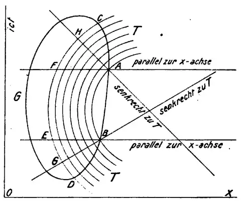 2. Let us consider a system of electric charges connected by a rigid dielectric, being under the action of an electrostatic field, partially stemming from the system itself, and partially from external causes, describing a world-tube in the world.[3] We further assume, that the motion is translatory, by which we understand: When we consider any Lorentz-Einstein reference frame and assume, in which at a certain moment, for example at time zero, a point of our conducting system is at rest, then all points of the conducting system must rest at time zero. From that it follows, that the world-lines of the points of our system are the orthogonal paths of a family of linear spaces; the rigidity is expressed by the condition, that the shape of the system in these spaces remains unchanged.