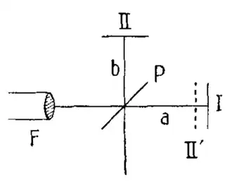 The error of Kohl lies at another place. The author namely assumes, that it is about interferences of same inclination at a plan-parallel plate; namely, according to him the boundaries of the telescope- and the collimator objective should constrict the ray path, so that only the midmost spot of the whole ring-system should be visible, so that has (with optical precision) the same value everywhere in the visual field.[6] This emerges with full certainty from his Fig. 3 and 4; because while discussing them on the basis of the doubling of the light source under consideration of smallest angles (), the angles between the mirrors and as well as and are always assumed as being exactly 45°; this also follows from the fact, that he always sees the arm lengths and as slightly different, and eventually from the fact, that (neglecting the difference ) the inclination of the rays against the central ray occurs as the only variable that determines the intensity. To explain the occurrence of rectilinear parallel rays, he makes the assumption not supported by any comment in the publications of Michelson or Morley, that light experiences diffraction at a slit being fixed at the collimator lens.[7] As one can see, according to him there is a interference phenomenon of constant phase difference between two equal diffraction images. Now, that under these assumptions no fringe displacement arises as the consequence of a change of arm lengths or as the effect of motion, but (with homogeneous light) only an uniform change of brightness in the entire image, can be seen without calculation.[8] Though it is near at hand, that it has nearly nothing to do with the real Michelson experiment any more, whose conclusiveness is in no way affected by that.