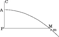 4. Let us proceed to the case of uniform gravity or, more generally, to the case in which a moving particle is acted upon by a downwards force of constant acceleration . Let the trajectory of the particle under these conditions be AM (Figure 26), let Mm represent the infinitesimal distance , and let and represent the vertical coordinate along AP and the horizontal coordinate along the perpendicular axis PM, respectively. The external force produces an acceleration described by , which integrates to . Hence, we seek the trajectory that minimizes the integral . Defining , we have ; in other words, we seek the trajectory that minimizes . Comparing this expression with our general formula , we see that and, given that , we obtain and . Minimization requires that and, since in this case, and, thus, , where is a constant. Hence, we have the differential equation . This may be rearranged to and separated . Integration yields the trajectory solution .