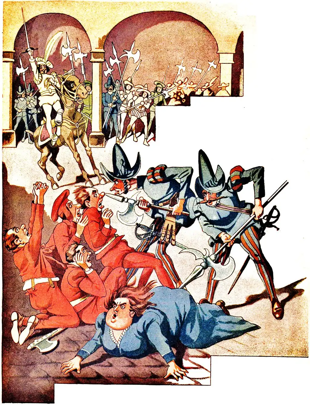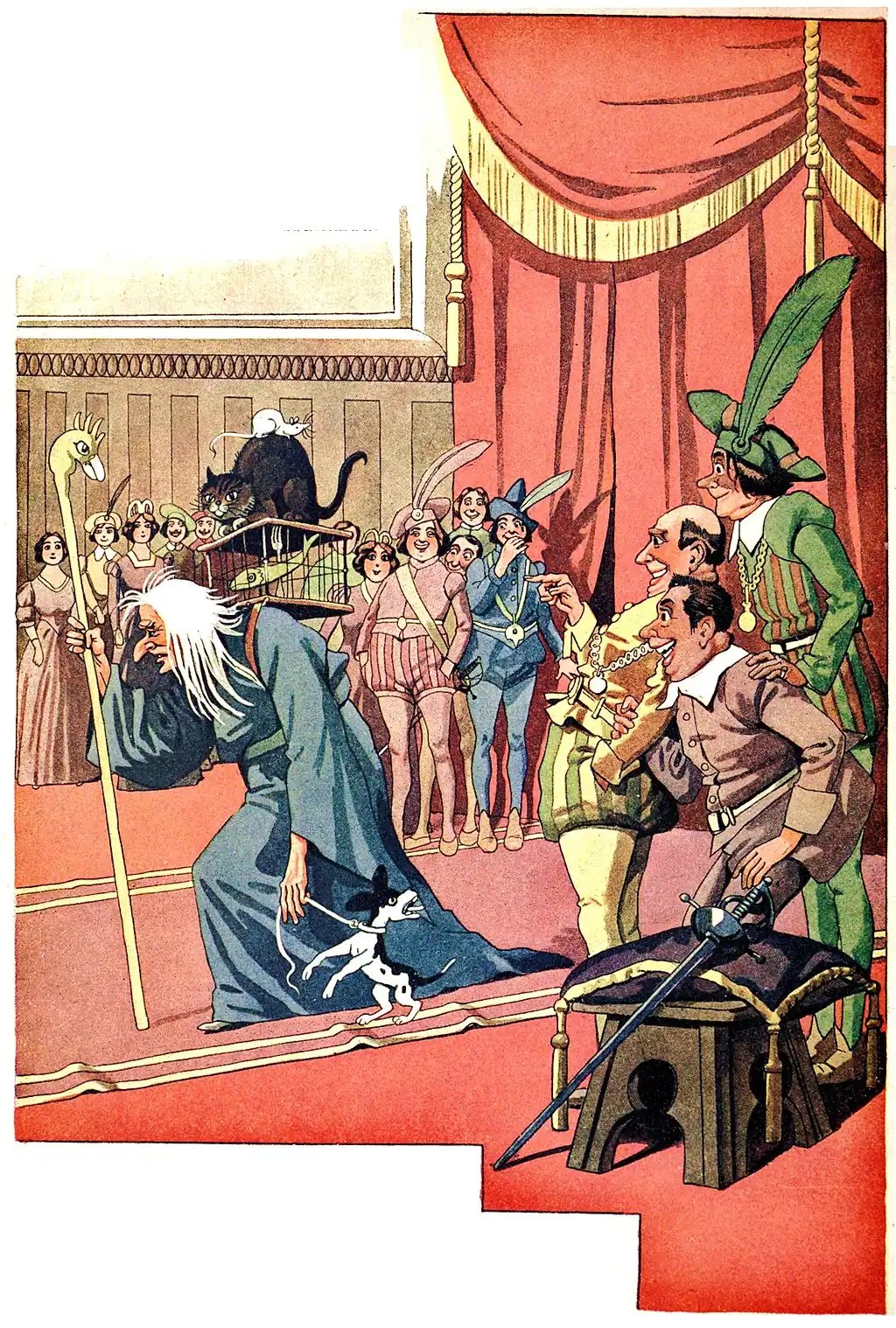 into the hall one very old Fairy, who did not receive an invitation because she was presumed dead. The kings showed her to a prominent place, but they could not provide her with gold utensils like the other Fairies, so the old lady, feeling annoyed, begin murmuring through her teeth.