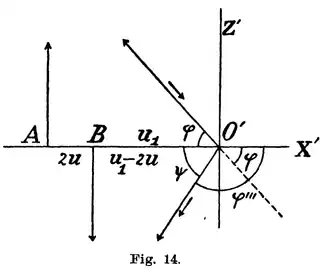 In the following I would like to give a non-Euclidean interpretation of Einstein's formulas for the reflection of light at moving mirrors.[1] The ray of light incident at a reflecting coordinate plane shall be defined by the quantities , , . These quantities are related to a stationary coordinate system. Mirror shall move with velocity in the direction of the positive abscissa axis of the stationary system. For the direction cosine of the reflected ray, one thus has the formula according to Einstein:
