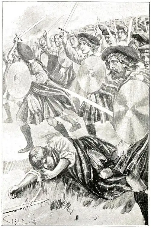 A short time later there emerged from that cottage a goodly youth in the Gordon kilt, and with all the weapons that a Highland lad carries with him into the battle. The bonnet was set upon a mass of tawny floating curls, and the great grey eyes were full of fire and light.