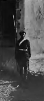 From here the road runs to Bhimphedi, the real entrance to Nepal. From Raxaul to Bhimphedi one travels merely through jungle, slowly it is true, rising at Bhimphedi to an approximate height of 2600 feet Here Indian methods of transport are quite put in the shade. My luggage, brought in on elephants, was immediately taken charge of by officials, who gave me a receipt, saying the luggage would go with me and that I was to pay in Nepal according to weight, which I did two days later without any trouble at all, although the porters had been changed on the road. This is something like organisation. I was so elated that I challenged a local porter, who was to carry my change of clothes up to the bungalow of Chissa Garhi, 2500 feet straight above, to a race. He beat me very easily, but waited for me on his arrival. When, very hot and much winded, I reached the top of the ascent, it was quite dark. I was challenged by a sentry in what seemed to me a rather curious manner. Finally he said, “Who are you?” I answered, “I am me.” Possibly it was the grammar that upset him, but he became very angry and said, “Tell me at once who you are.” I answered, “God made me like you.” He got very angry and shouted out to the commander of the guard, “Here is a man who says that God made him, and that is all he will say; what shall I do?” Upon which the whole guard-house turned out, and among them an officer, who had been warned that he was to expect me. He was much amused, and we laughed loud and long. The sentry was quite a smart youth. His photograph, which I took next day, may be seen on the opposite page.
