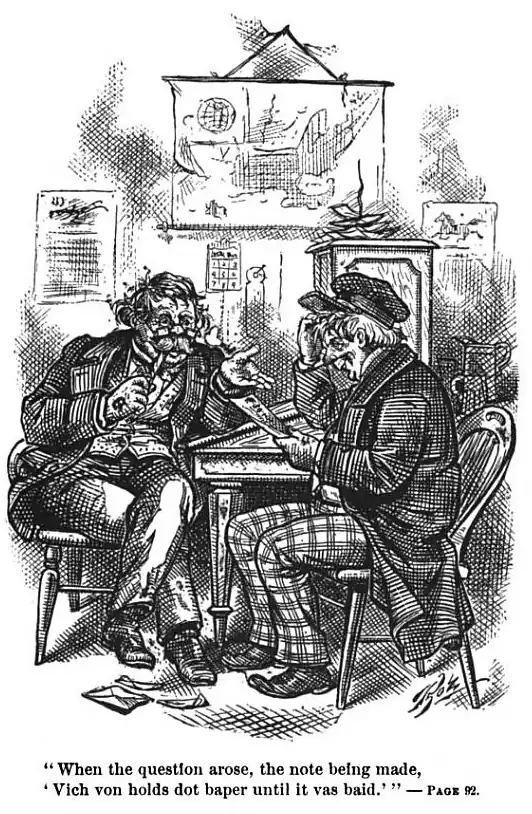 - "I, Hans, gets from Fritz feefty tollars to-day;"