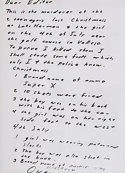 - Zodiac Killer letter, San Francisco Examiner, July 31st 1969