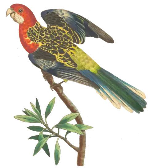 Amidst the number os these admired animals, the species represented on the annexed plate may justly claim a distinguished place. It may indeed be doubted whether any bird can exhibit a plumage more elegant, or colours os a nobler hue. These are so accurately expressed on the plate, as well as mentioned in the specisic character, that it becomes unnecessary to particularise them here. It therefore remains only to add, that the size of this species is equal to that os the Pennantian, or Splendid Parrot, to which it is also nearly allied in shape and general disposition of colours.